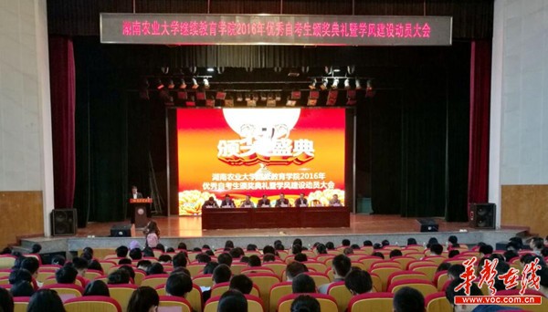 华声在线10月26日讯(记者 邓桂明 通讯员 裴昌胜) 自考生也可领丰厚的奖学金,你听说过没?湖南农业大学大礼堂今日人气旺盛,雄壮嘹亮的国歌拉开了湖南农业大学优秀自考生颁奖典礼暨学风建设动员大会的帷幕,来自该校继续教育学院81个班级的64名学生(含优秀贫困自考生)和16个优秀班级和寝室代表,满怀喜悦地领取了30万元的奖助学金和先进集体奖,1200多名师生见证了颁奖仪式。