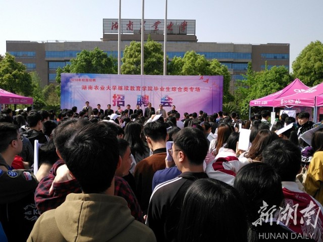 新湖南客户端4月17日讯(通讯员 裴昌胜 记者 胡泽汇)今日,湖南农业大学继续教育学院2018届毕业生综合类专场招聘会在湖南农业大学修业广场举行。100多家单位为该校近千名毕业生提供了2000多个职位。湖南省内自考生专场招聘会目前只有湖南农业大学继续教育学院举办,今年为第二届。