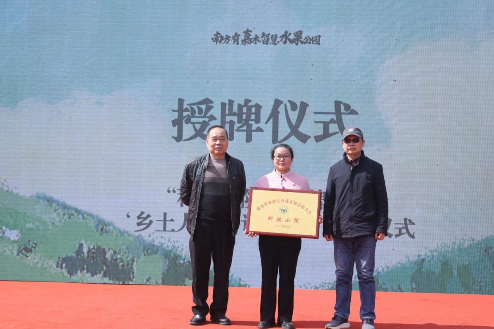 活动现场,湖南农业大学教授、博士生导师、享受国务院政府特殊津贴专家邓子牛为活动致辞。他高度评价了智慧水果公园的创新模式,指出其将现代农业技术与田园诗意生活完美融合,是高校科研成果转化、赋能乡村产业发展的生动实践。随后,湖南农业大学教授、湖南省人民政府参事王仁才将“科技小院”牌匾授予南方有嘉木智慧水果公园,标志着这片充满希望的田野将在科技兴农、人才培育领域承担起更重要的使命。